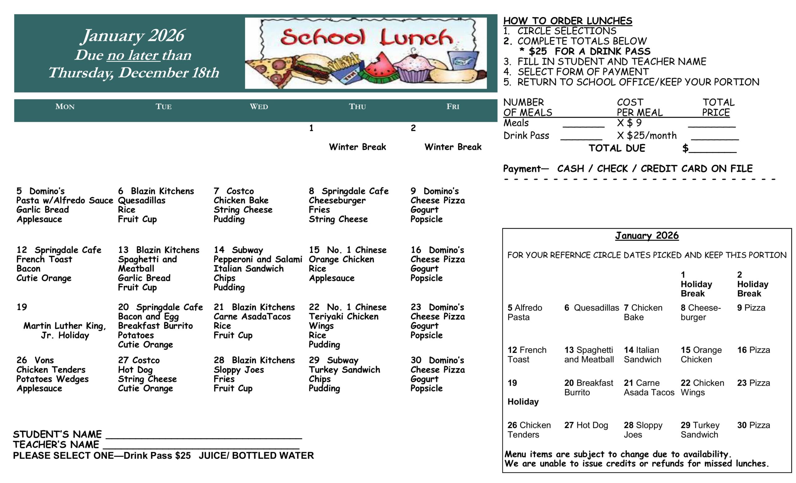 January 2026 Lunch Menu